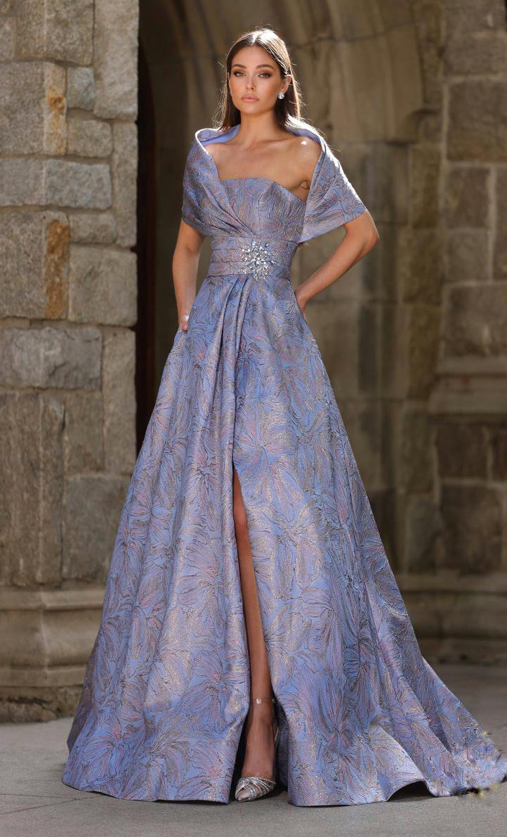 Vestido largo de tela brocada con detalles metálicos, manga off the shoulder, ajustado a la cintura, aplicación de canutillo, falda en corte A, abertura al frente y cierre invisible.
