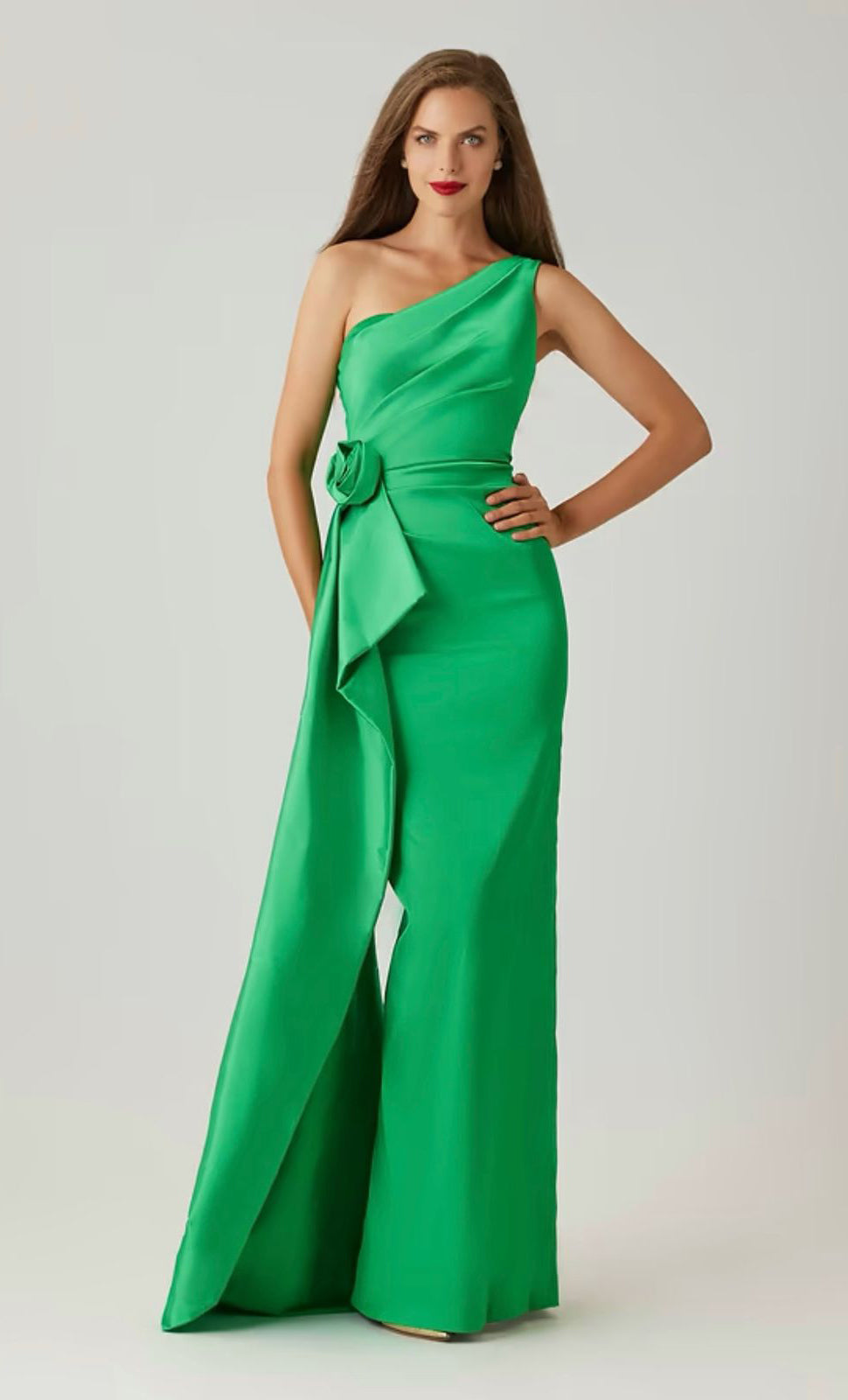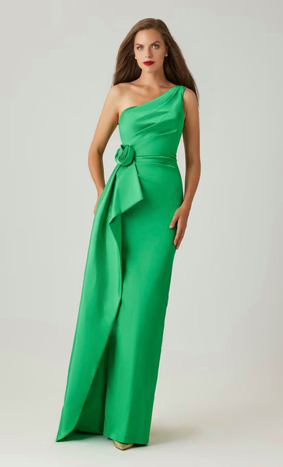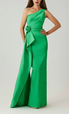 Vestido largo de tafeta, un hombro, detalle de estola que cae en costado con flor en 3D, corte al cuerpo, abertura posterior y cierre invisible.