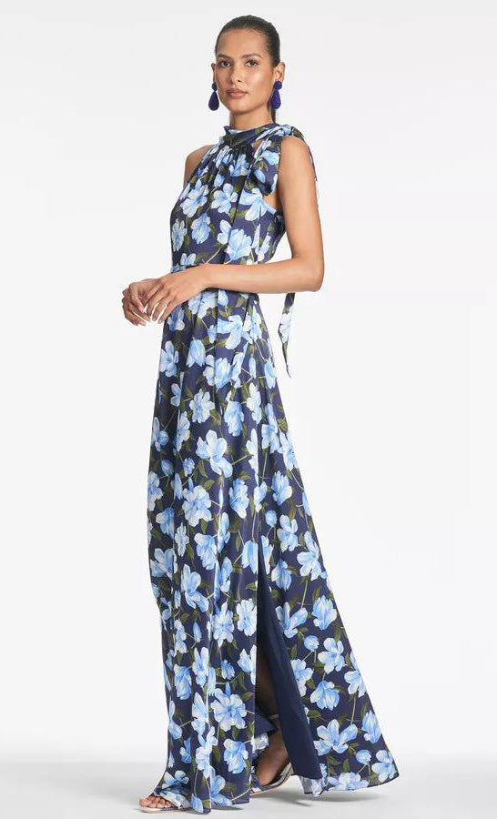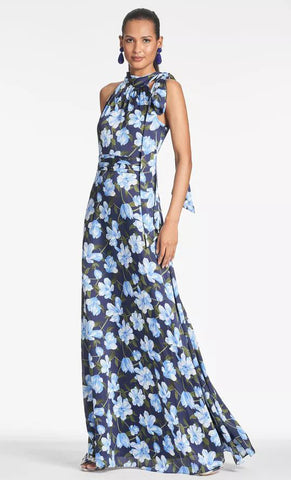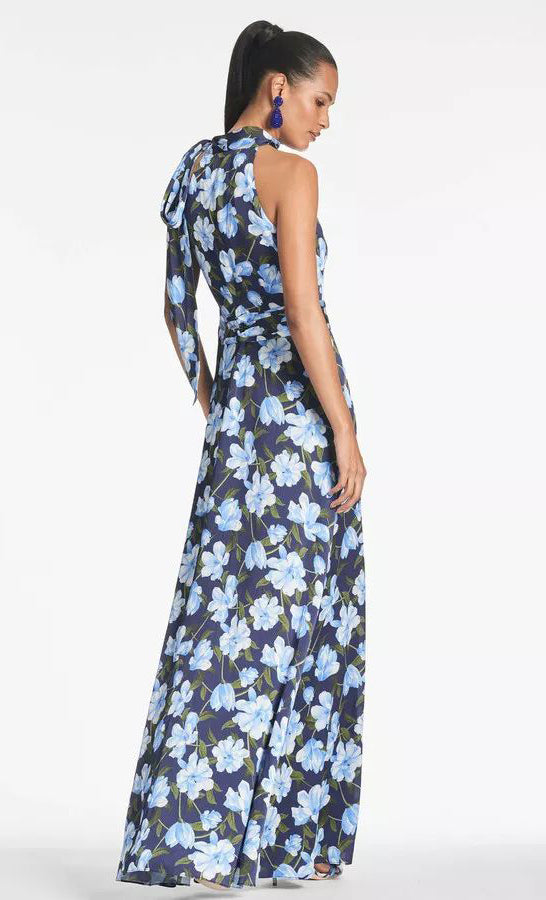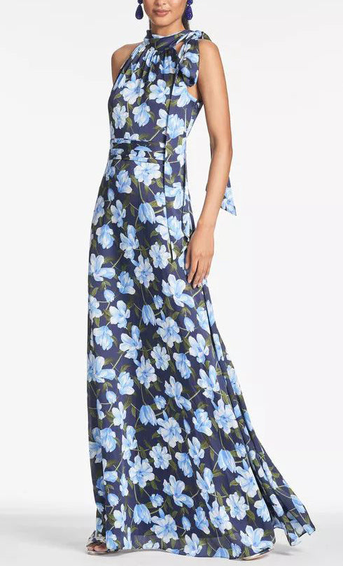 Vestido largo de gasa con print, cuello halter, detalle de listón en hombro, ajustado a la cintura, falda en corte A con movimiento y cierre invisible.