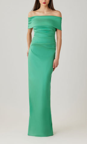 Vestido largo de mikado, manga off the shoulder, detalle de pliegues en cintura, corte al cuerpo, abertura posterior y cierre invisible.