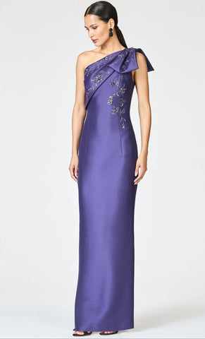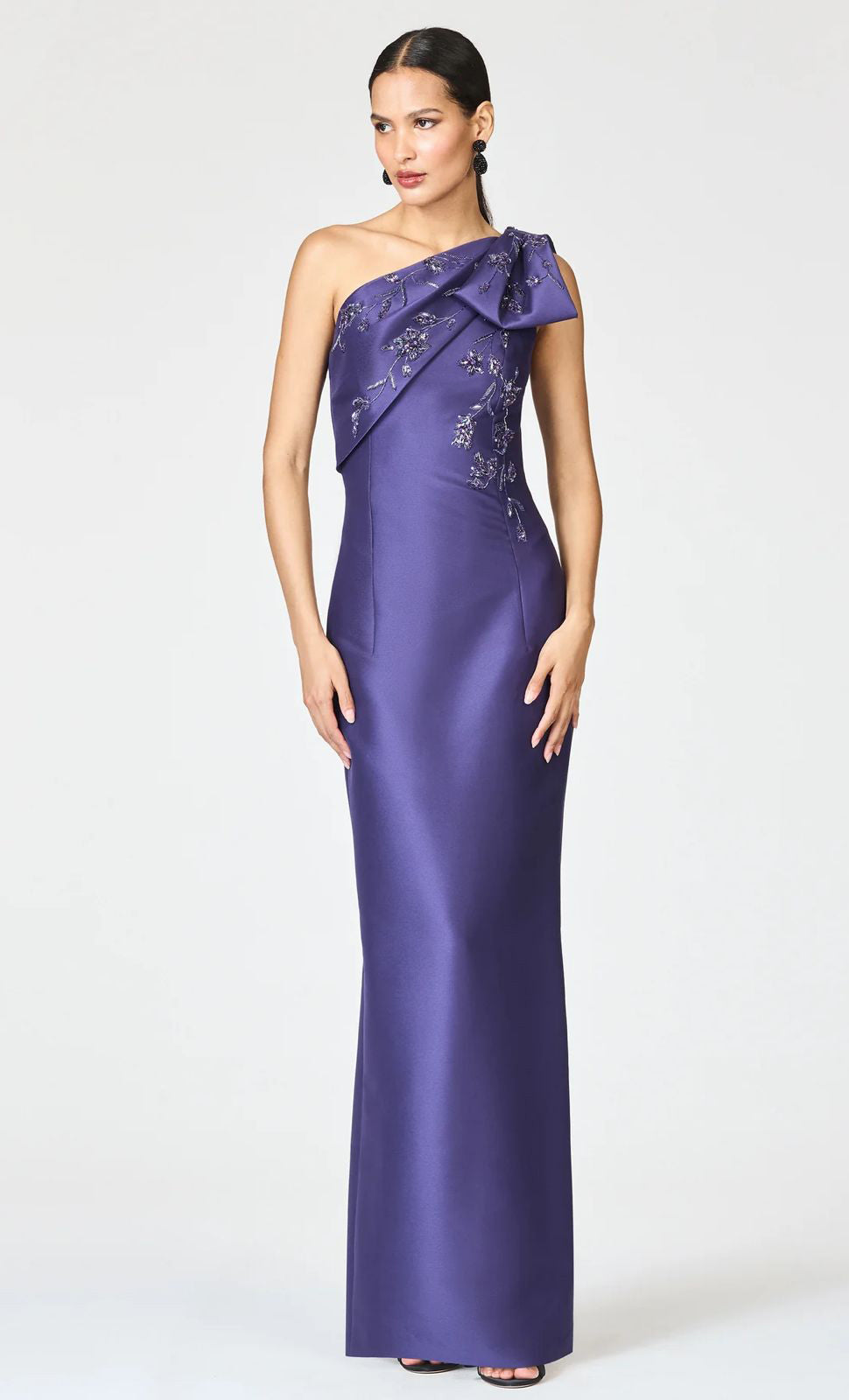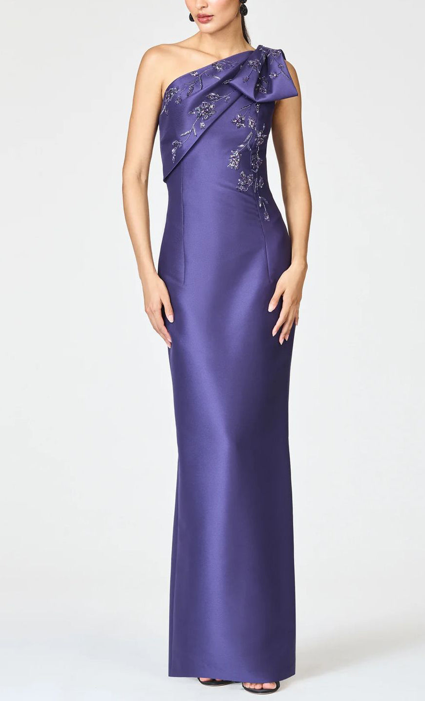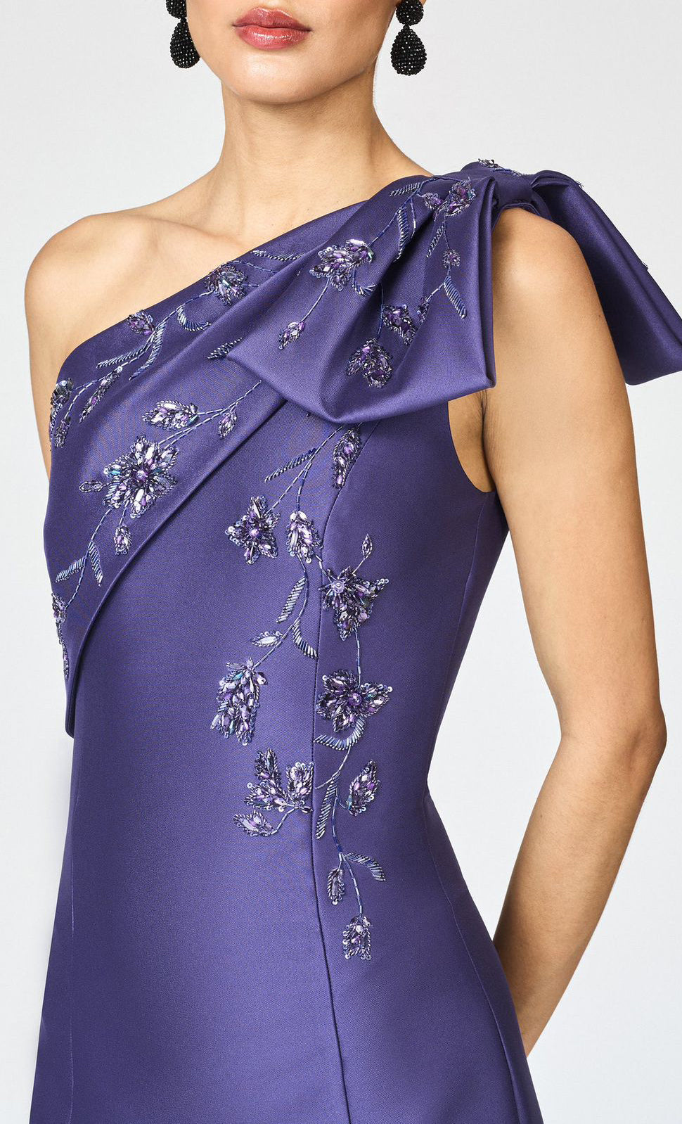 Vestido largo de mikado stretch, un hombro con moño, detalle de bordado en parte superior, corte al cuerpo, abertura posterior y cierre invisible.