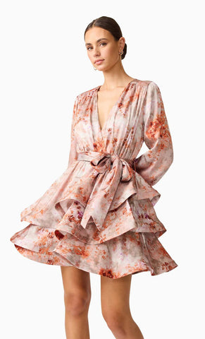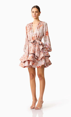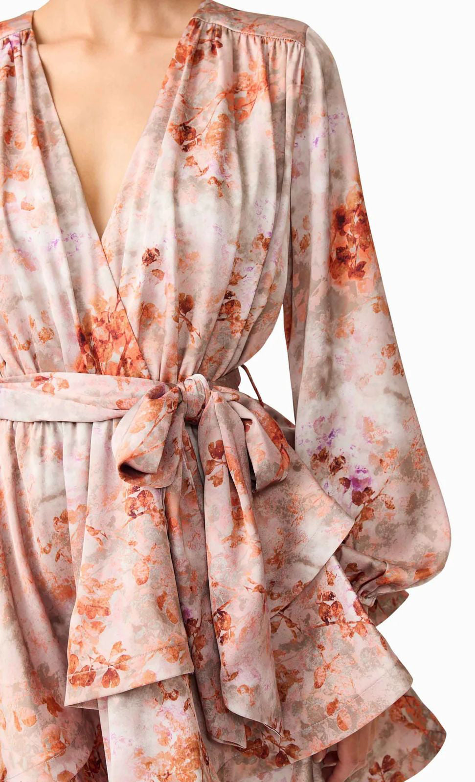 Vestido mini de satín con print, escote en V, manga larga abullonada, ajustado a la cintura, falda con olanes y volumen, movimiento.
