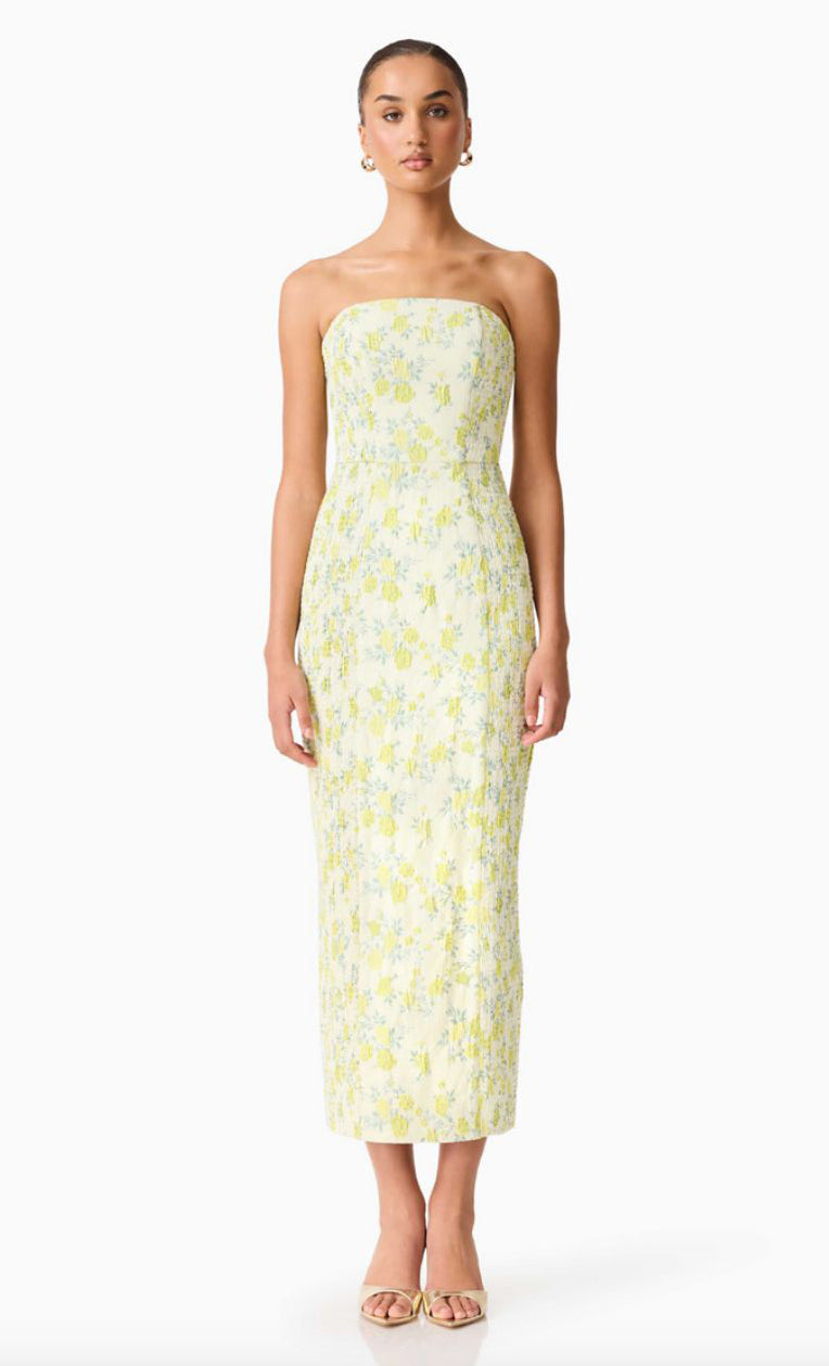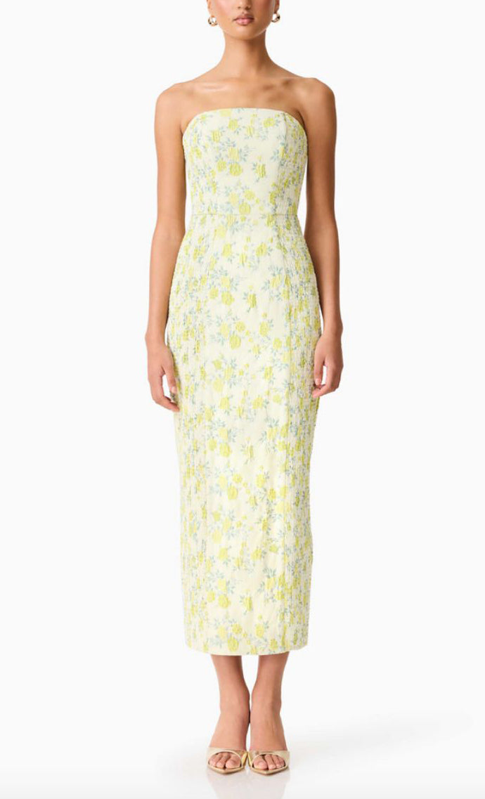 Vestido midi de tela brocada, strapless, detalle de tela stretch en costados, corte al cuerpo, abertura posterior y cierre invisible.