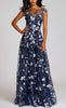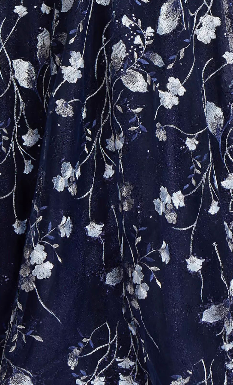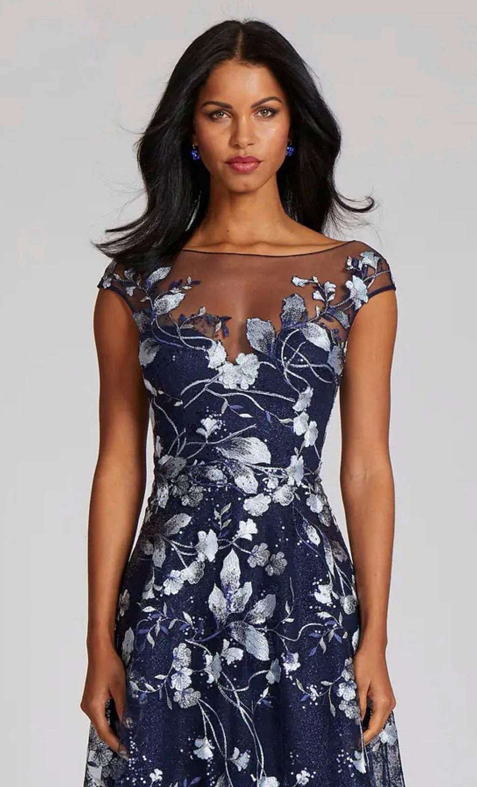 Vestido largo de tul completamente bordado, manga corta, ajustado a la cintura, falda en corte A con movimiento y cierre invisible.