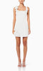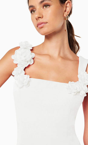 Vestido mini de stretch crepe, tirantes gruesos, detalle de flores en 3D, corte al cuerpo y cierre invisible.