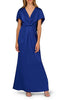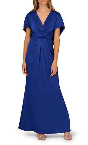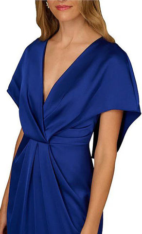 Vestido largo de satín, escote en V, detalle de capa con manga, corte al cuerpo, movimiento y cierre invisible.