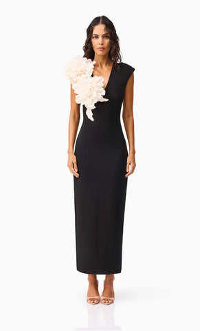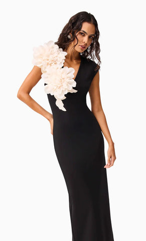 Vestido largo de stretch crepe, escote en V, detalle de flor en 3D, corte al cuerpo y cierre invisible.