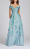 Vestido largo brocado con detalles metálicos, manga off the shoulder, ajustado a la cintura, falda en corte A con movimiento y cierre invisible.