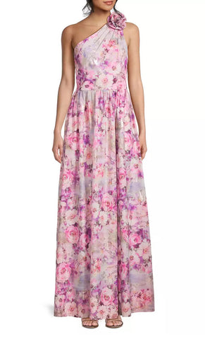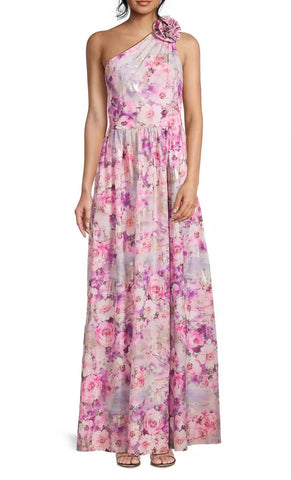 Vestido largo de tela texturizada con detalles metálicos, un hombro con detalle de flor 3D, ajustado a al cintura, falda en corte A, movimiento y cierre invisible.